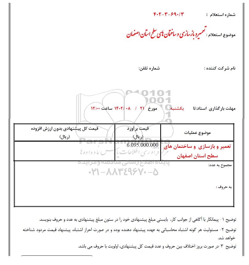موضوع استعلام: استعلام تعمیر و بازسازی و ساختمان های سطح استان اصفهان