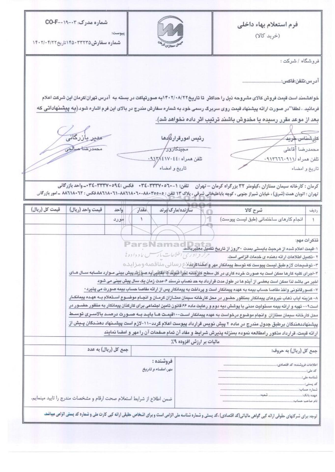 خواهشمند است قیمت فروش کالای مشروحه ذیل را حداکثر تا تاریخ 1402.8.22 به صورت پاکت در بسته به آدرس تهران / کرمان این شرکت اعلام فرمائید. لطفا در صورت ارائه پیشنهاد قیمت روی سربرگ رسمی خود به شماره سفارش مندرج در بالای این فرم اشاره شود (به پیشنهاداتی که بعد از موعد مقرر رسیده یا مخدوش باشند ترتیب اثر داد نخواهد شد)