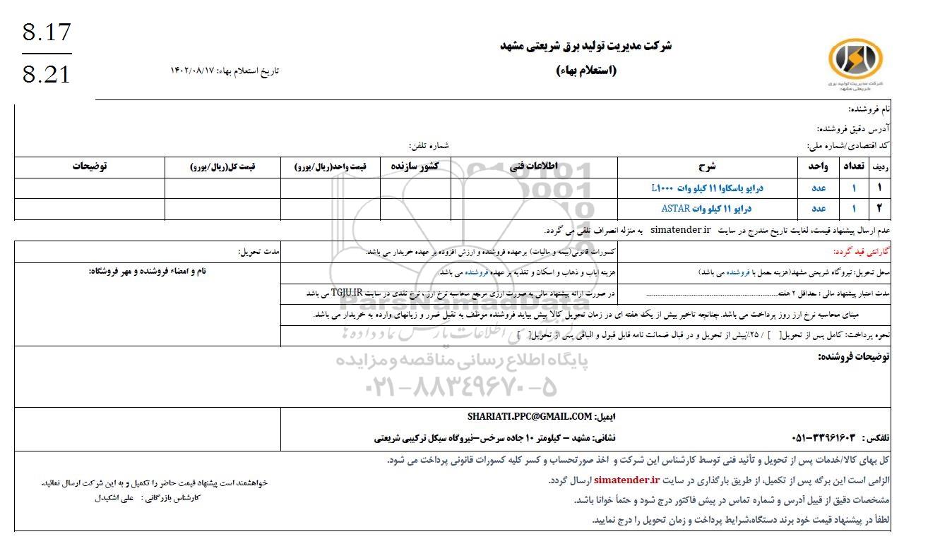 شرکت مدیریت تولید برق شریعتی مشهد (استعلام بهاء) ؟