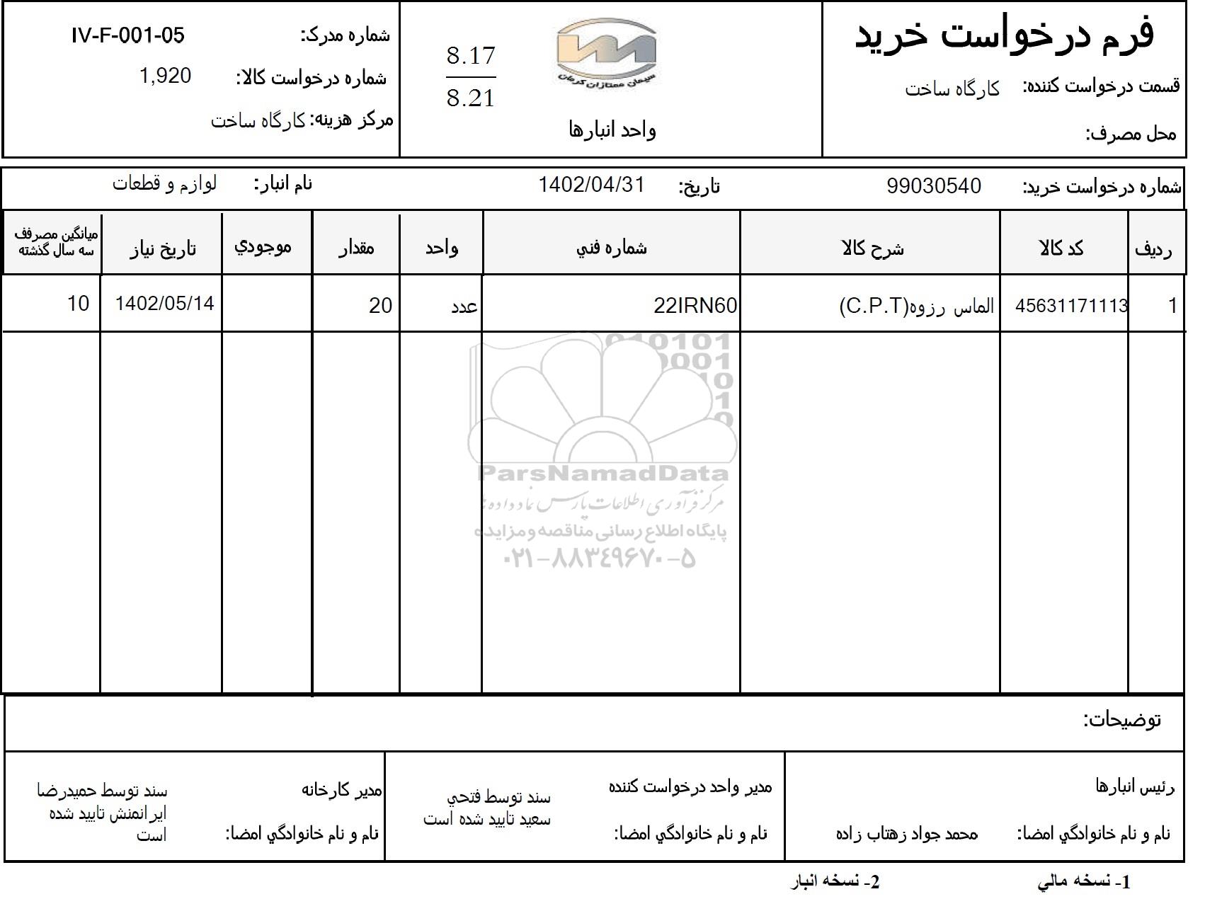 | 1 | 45631171113 | الماس رزوه (C.P.T) | 22IRN60 | عدد | 20 |