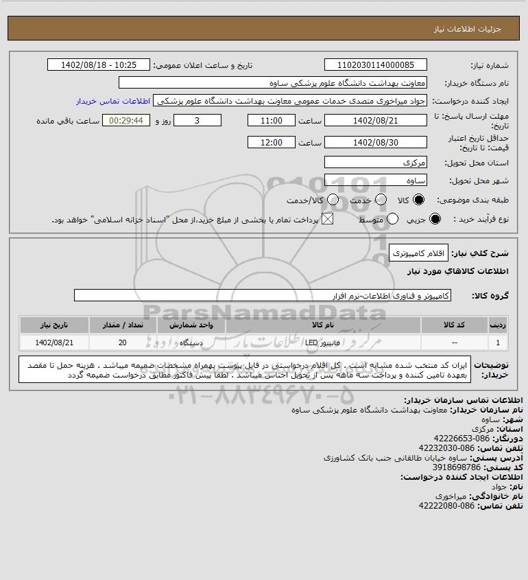 | 1 | -- | مانیتور LED | دستگاه | 20 | 1402/08/21 |