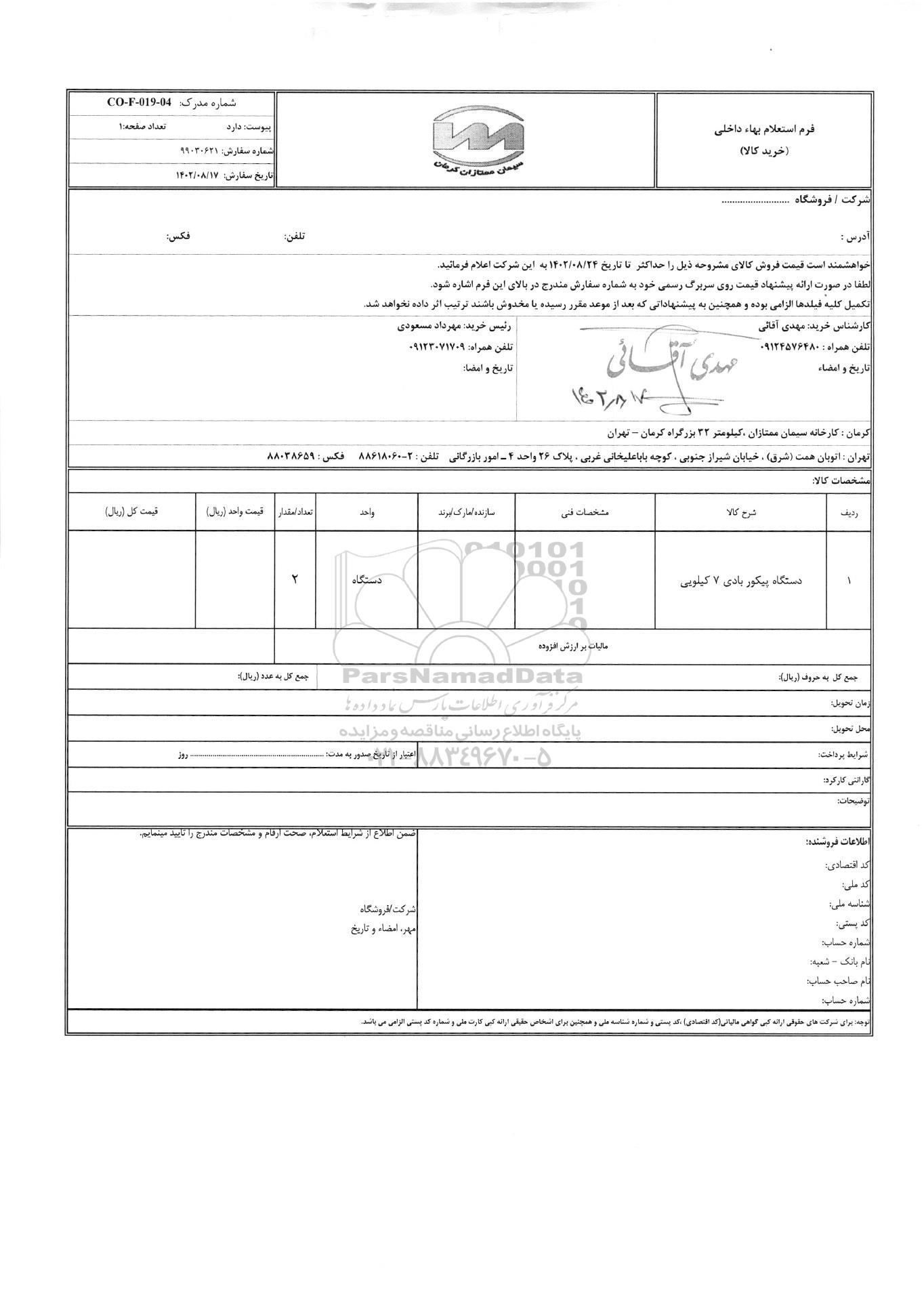 لطفا در صورت ارائه پیشنهاد قیمت روی سربرگ رسمی خود به شماره سفارش مندرج در بالای این فرم اشاره شود