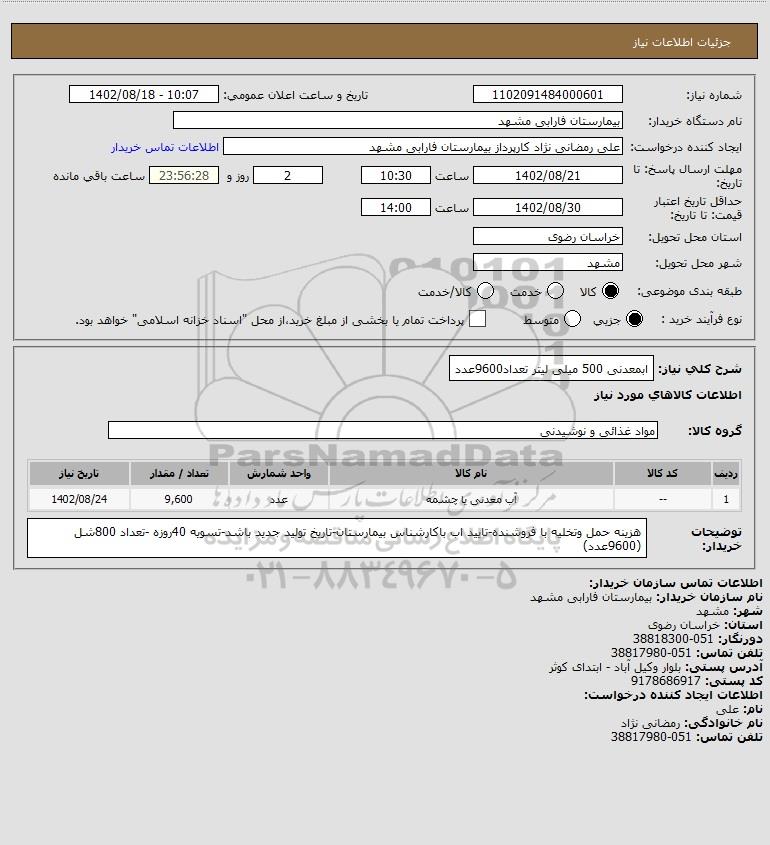 شرح کلی نیاز: ابمعدنی 500 میلی لیتر تعداد9600عدد