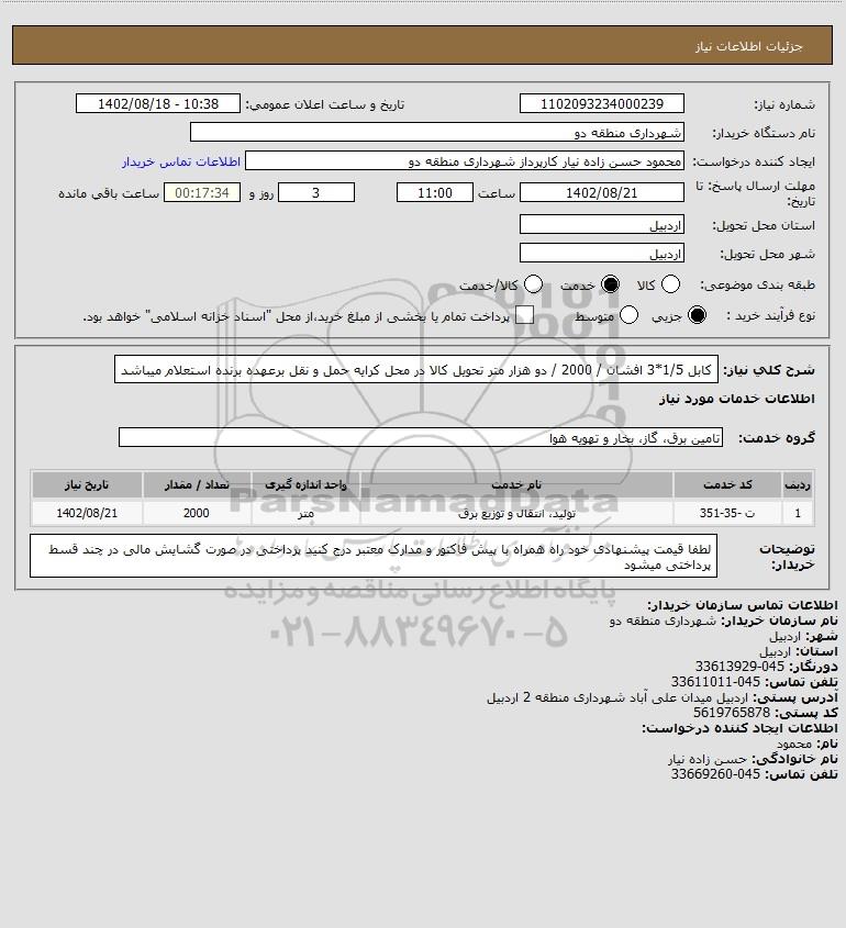 شرح کلی نیاز: کابل 1/5*3 افشان / 2000 / دو هزار متر