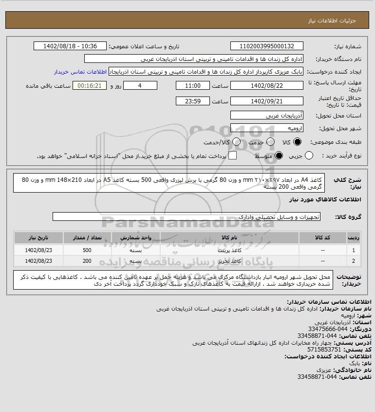 توضیحات خریدار:محل تحویل شهر ارومیه انبار بازداشتگاه مرکزی می باشد و هزینه حمل بر عهده تامین کننده می باشد . کاغذهایی با کیفیت ذکر شده خریداری خواهند شد . ازارائه قیمت به کاغذهای نازک و سبک خودداری گردد پرداخت آخر دی