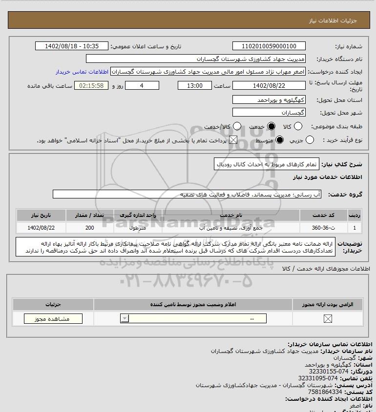 شرح کلی نیاز: تمام کارهای مربوط به احداث کانال رودبال