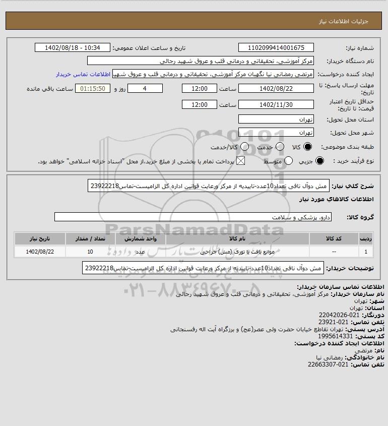 شرح کلی نیاز: مش دوآل نافی تعداد10عدد-تاییدیه از مرکز ورعایت قوانین اداره کل الزامیست-تماس23922218