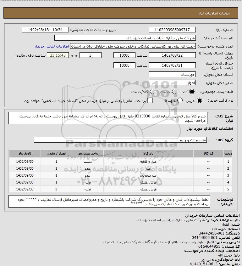 شرح کلی نیاز: شرح کالا مبل فرش.. شماره تقاضا 0210030 طبق فایل پیوست . توجه: ایران کد مشابه می باشد حتما به فایل پیوست مراجعه شود.