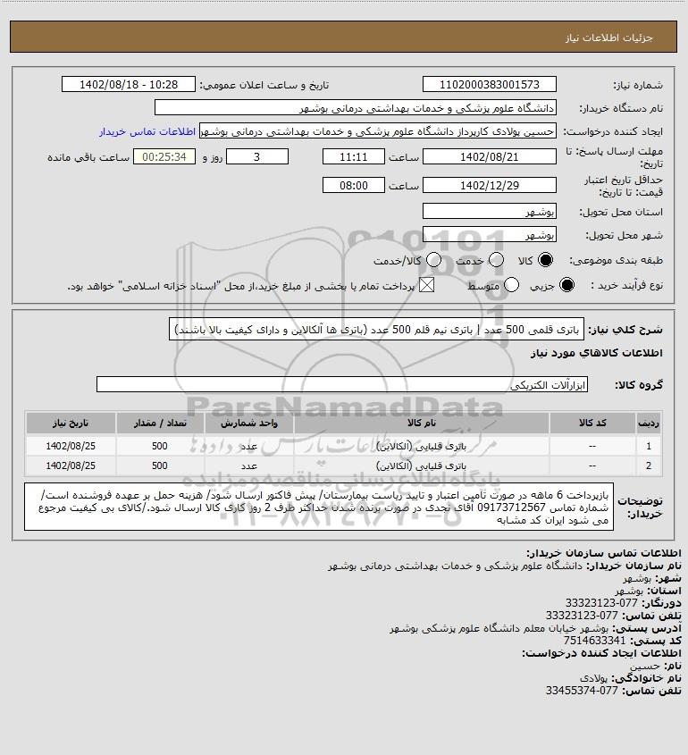 | 2 | -- | باتری قلیایی (آلکالاین) | عدد | 500 | 1402/08/25 |