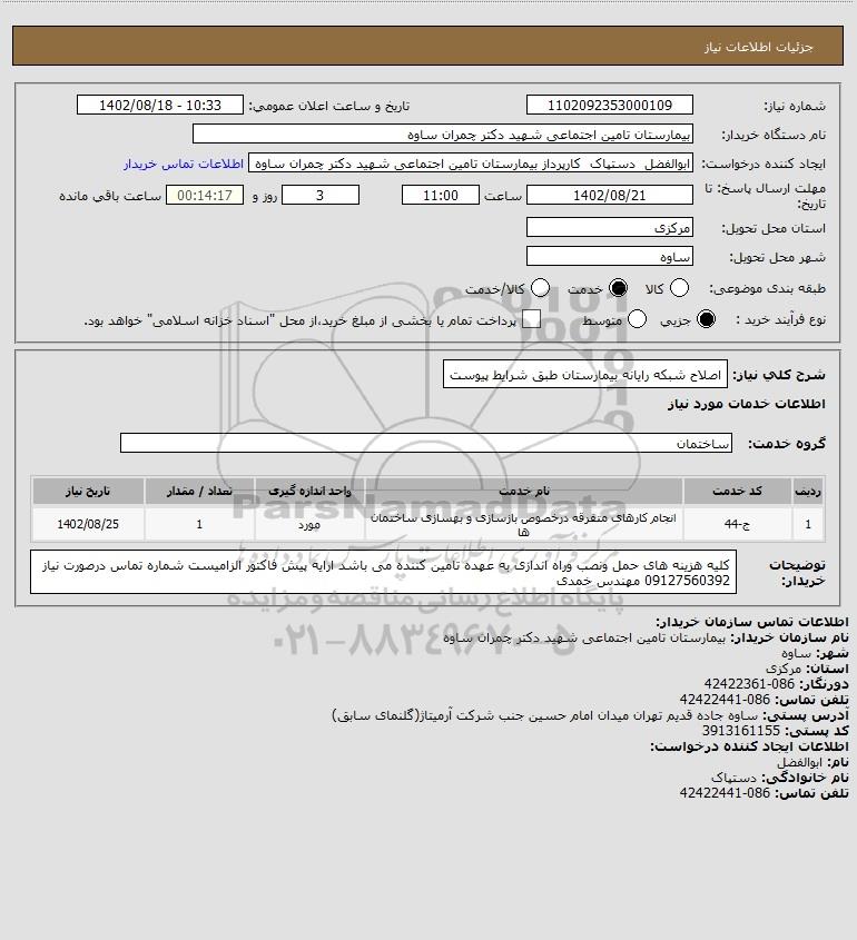 شرح کلی نیاز: اصلاح شبکه رایانه بیمارستان طبق شرایط پیوست