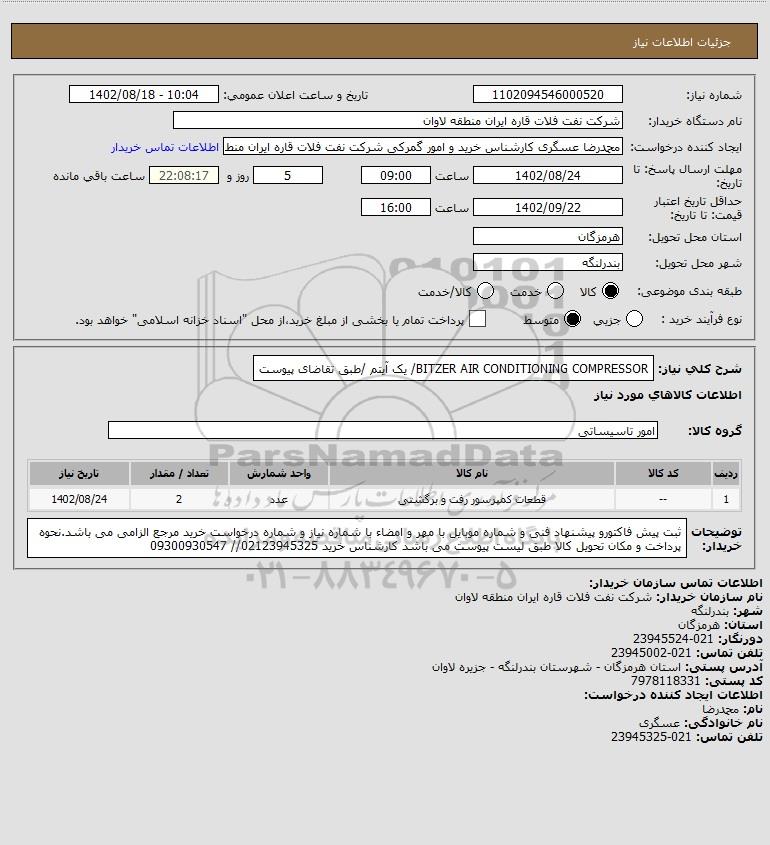 شرح کلی نیاز: BITZER AIR CONDITIONING COMPRESSOR/ یک آیتم /طبق تقاضای پیوست