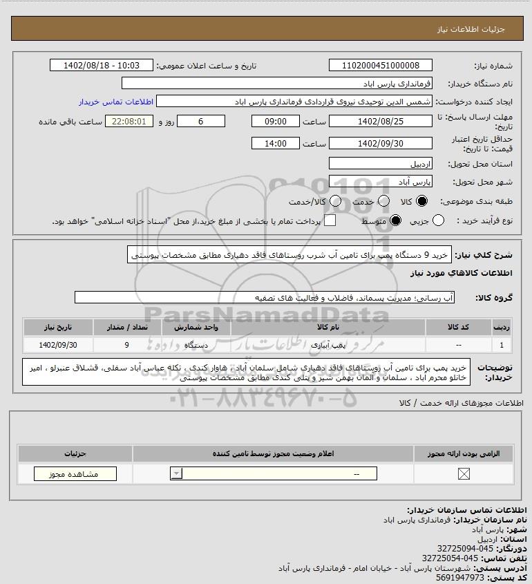 شرح کلی نیاز: خرید 9 دستگاه پمپ برای تامین آب شرب روستاهای فاقد دهیاری مطابق مشخصات پیوستی