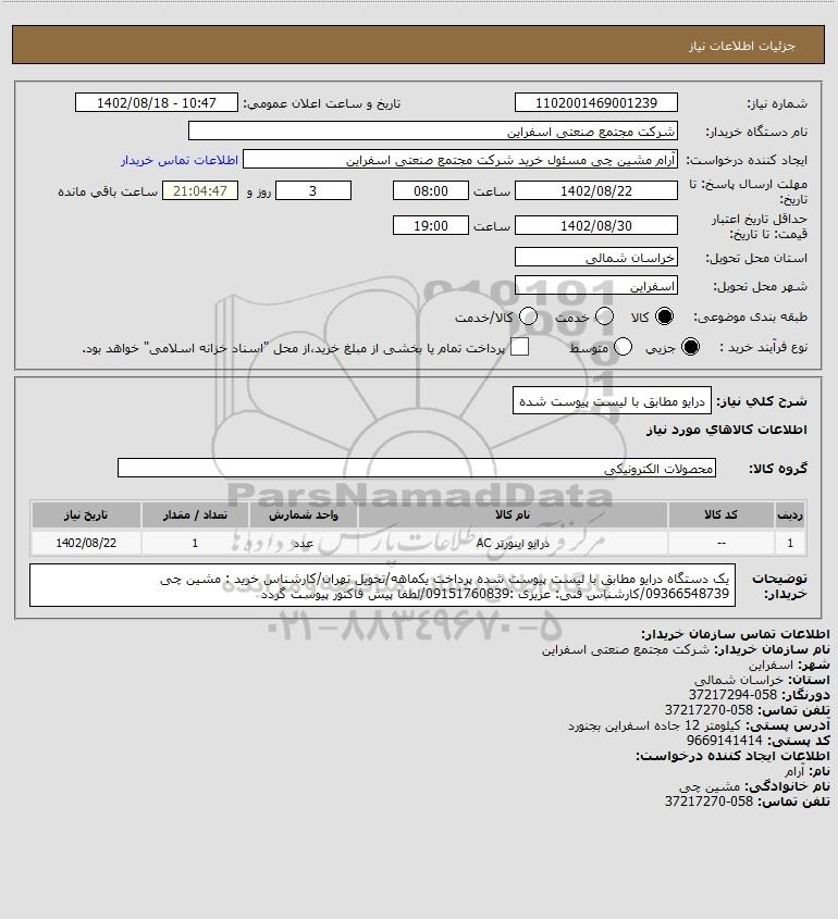 شرح کلی نیاز: درایو مطابق با لیست پیوست شده