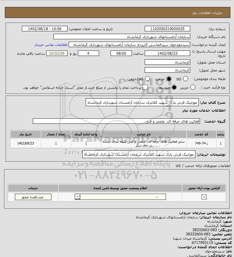 شرح کلی نیاز: موزاییک فرش پارک شهید کلانتری سازمان آرامستان شهرداری کرمانشاه