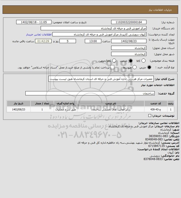 شرح کلی نیاز: تعمیرات مرکز هرسین اداره آموزش فنی و حرفه ای استان کرمانشاه طبق لیست پیوست