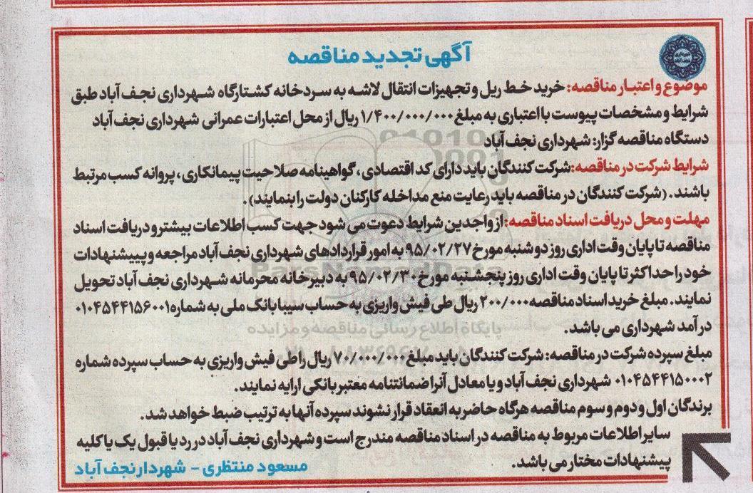 موضوع و اعتبار مناقصه: خرید خط ریل و تجهیزات انتقال لاشه به سردخانه کشتارگاه شهرداری نجف آباد طبق شرایط و مشخصات پیوست با اعتباری به مبلغ 1.400.000.000 ریال از محل اعتبارات عمرانی سال 94 شهرداری نجف آباد