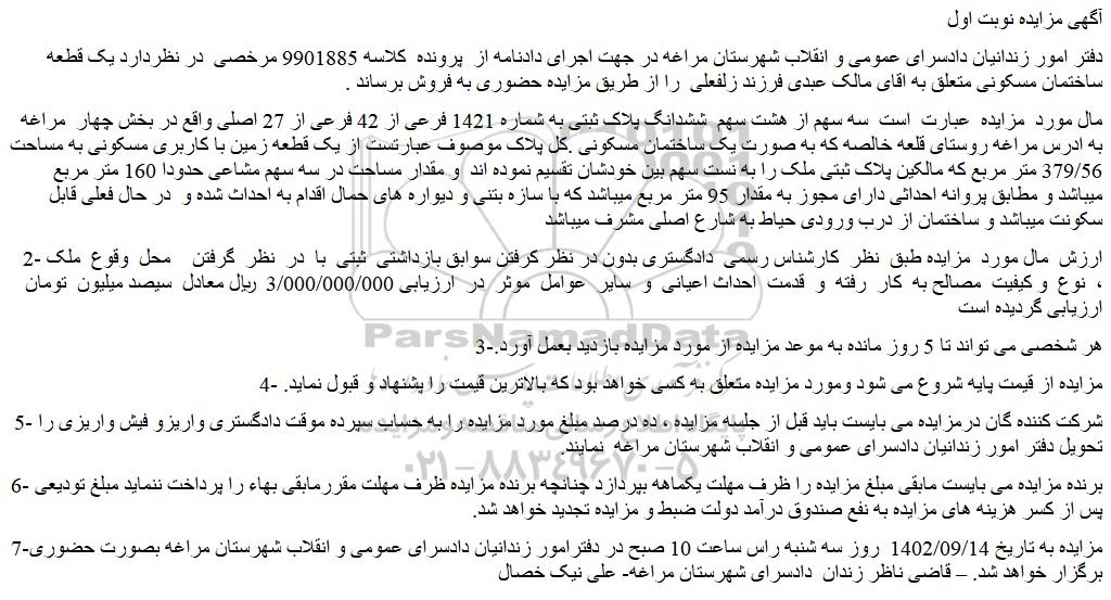 دفتر امور زندانیان دادسرای عمومی و انقلاب شهرستان مراغه در جهت اجرای دادنامه از  پرونده  کلاسه 9901885 مرخصی  در نظردارد یک قطعه ساختمان مسکونی متعلق به اقای مالک عبدی فرزند زلفعلی  را از طریق مزایده حضوری به فروش برساند .