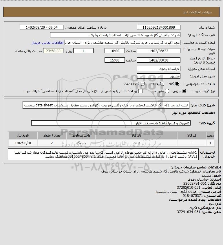 نام دستگاه خریدار:شرکت پالایش گاز شهید هاشمی نژاد استان خراسان رضوی