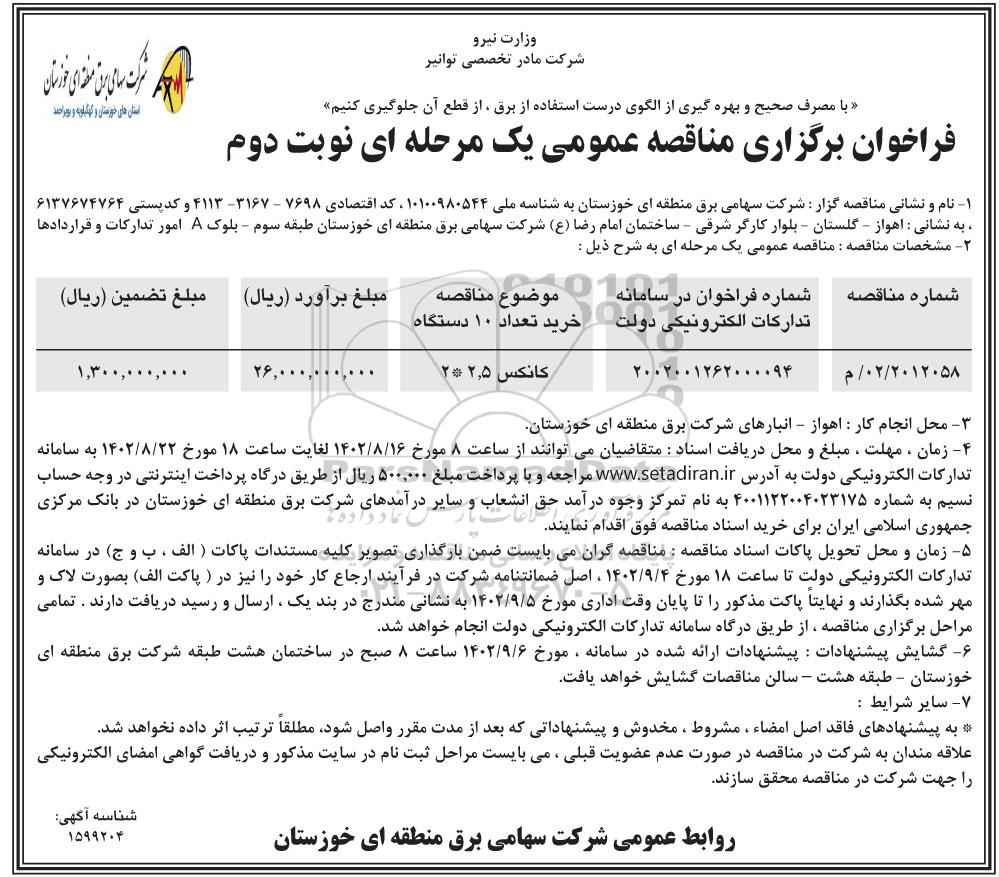 گشایش پیشنهادات پیشنهاد : پیشنهادات ارائه شده در سامانه مورخ 1402.9.6 ساعت 8 صبح در ساختمان هشت طبقه شرکت برق منطقه ای خوزستان ـ طبقه هشت ـ سالن مناقصات گشایش خواهد یافت.