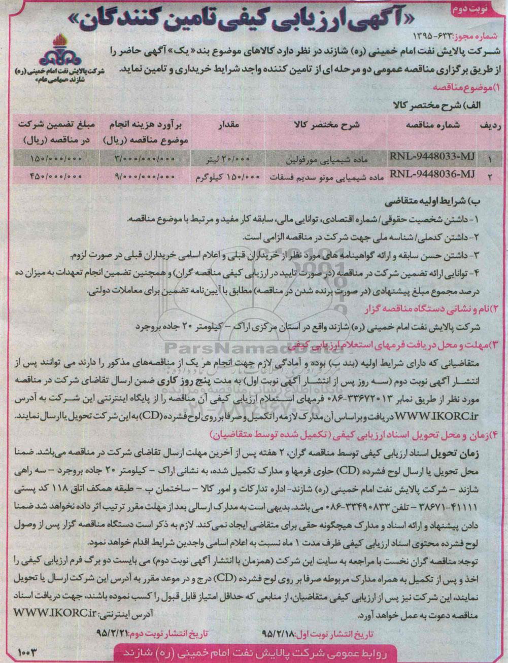 | 1 | RNL-9448033-MJ | ماده شیمیایی مورفولین | 20.000 لیتر | 3.000.000.000 | 150.000.000 |