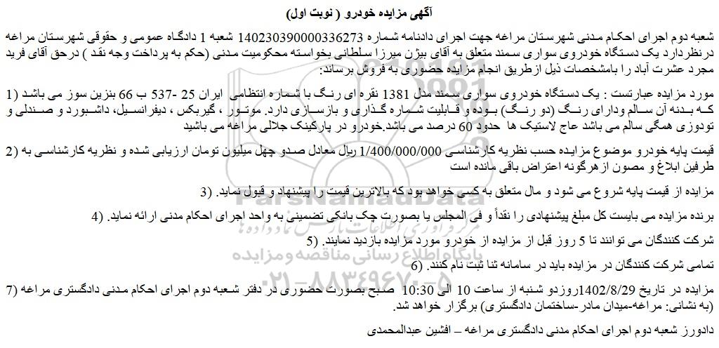 شعبه دوم اجرای احکام مدنی شهرستان مراغه جهت اجرای دادنامه شماره 140230390000336273 شعبه 1 دادگاه عمومی و حقوقی شهرستان مراغه درنظردارد یک دستگاه خودروی سواری سمند متعلق به آقای بیژن میرزا سلطانی بخواسته محکومیت مدنی (حکم به پرداخت وجه نقد ) درحق آقای فرید مجرد عشرت آباد را بامشخصات ذیل ازطریق انجام مزایده حضوری به فروش برساند: