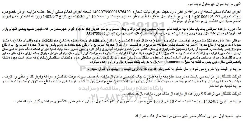 - مزایده در تاریخ 1402/9/7 روزسه شنبه ساعت 10 الی 10:30صبح بصورت حضوری در دفترشعبه اول اجرای احکام مدنی دادگستری مراغه برگزار خواهد شد.