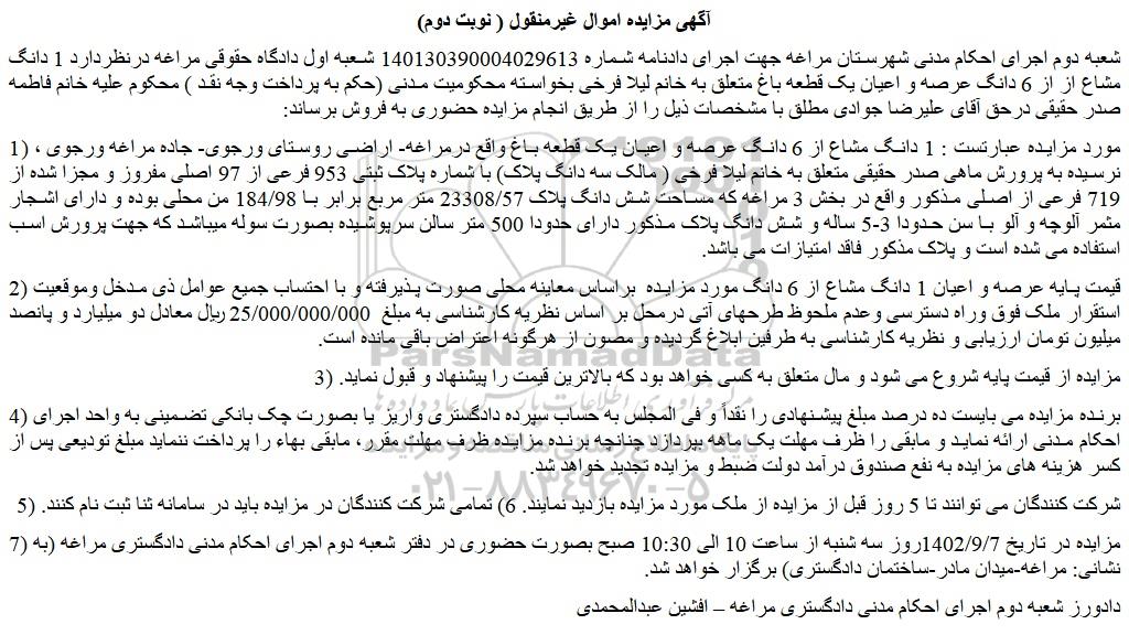 شعبه دوم اجرای احکام مدنی شهرستان مراغه جهت اجرای دادنامه شماره 140130390004029613 شعبه اول دادگاه حقوقی مراغه درنظردارد 1 دانگ مشاع از از 6 دانگ عرصه و اعیان یک قطعه باغ متعلق به خانم لیلا فرخی بخواسته محکومیت مدنی (حکم به پرداخت وجه نقد ) محکوم علیه خانم فاطمه صدر حقیقی درحق آقای علیرضا جوادی مطلق با مشخصات ذیل را از طریق انجام مزایده حضوری به فروش برساند: