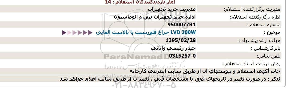 استعلام بها و موضوع استعلام مناقصه LVD 300W چراغ فلورسنت با بالاست القایی به اطلاع کلیه شرکتها و افراد متخصص واجد شرایط میرساند، آگهی گذار در نظر دارد از طریق استعلام بها، نسبت به انتخاب و دریافت پیشنهادات اقدام نماید. این استعلام با کد آگهی ثبت شده در سامانه خبرگزاری پارس نماد : 662265 منتشر شده است. مشخصات استعلام : تاریخ شروع استعلام: 1395/02/22 آخرین مهلت ارسال پیشنهاد قیمت : 1395/02/28 و محل اجرای پروژه : استان اصفهان میباشد. استعلام قیمت مورد درخواست : مناقصه LVD 300W چراغ فلورسنت با بالاست القایی با دستهبندیهای تخصصی و گروه های مرتبط : صنایع روشنایی, تجهیزات برق و الکترونیک, استعلام اطلاع رسانی میگردد.