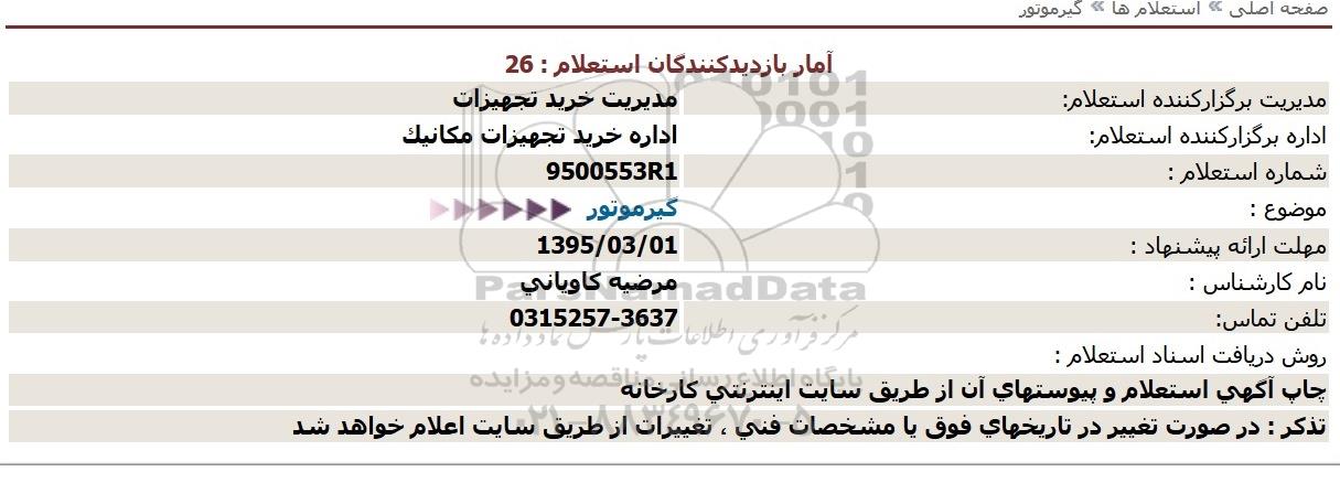 استعلام بها و موضوع استعلام استعلام,گیرموتور به اطلاع کلیه شرکتها و افراد متخصص واجد شرایط میرساند، آگهی گذار در نظر دارد از طریق استعلام بها، نسبت به انتخاب و دریافت پیشنهادات اقدام نماید. این استعلام با کد آگهی ثبت شده در سامانه خبرگزاری پارس نماد : 662269 منتشر شده است. مشخصات استعلام : تاریخ شروع استعلام: 1395/02/22 آخرین مهلت ارسال پیشنهاد قیمت : 1395/03/01 و محل اجرای پروژه : استان اصفهان میباشد. استعلام قیمت مورد درخواست : استعلام,گیرموتور با دستهبندیهای تخصصی و گروه های مرتبط : تجهیزات و ماشین آلات صنعتی, استعلام اطلاع رسانی میگردد.