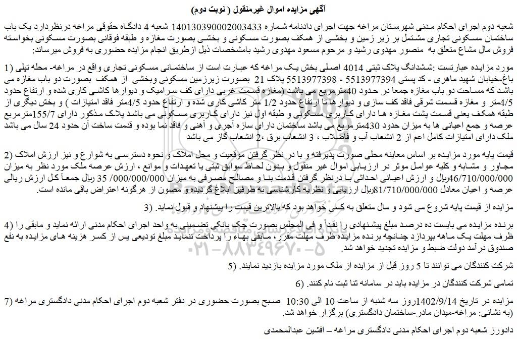 شعبه دوم اجرای احکام مدنی شهرستان مراغه جهت اجرای دادنامه شماره 140130390002003433 شعبه 4 دادگاه حقوقی مراغه درنظردارد یک باب ساختمان مسکونی تجاری مشتمل بر زیر زمین و بخشی از همکف بصورت مسکونی و بخشی بصورت مغازه و طبقه فوقانی بصورت مسکونی بخواسته فروش مال مشاع متعلق به  منصور مهدوی رشید و مرحوم مسعود مهدوی رشید بامشخصات ذیل ازطریق انجام مزایده حضوری به فروش میرساند: