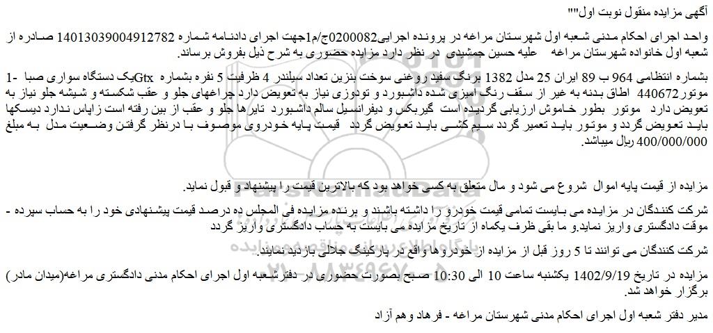 مزایده در تاریخ 1402/9/19 یکشنبه ساعت 10 الی 10:30 صبح بصورت حضوری در دفترشعبه اول اجرای احکام مدنی دادگستری مراغه(میدان مادر) برگزار خواهد شد.