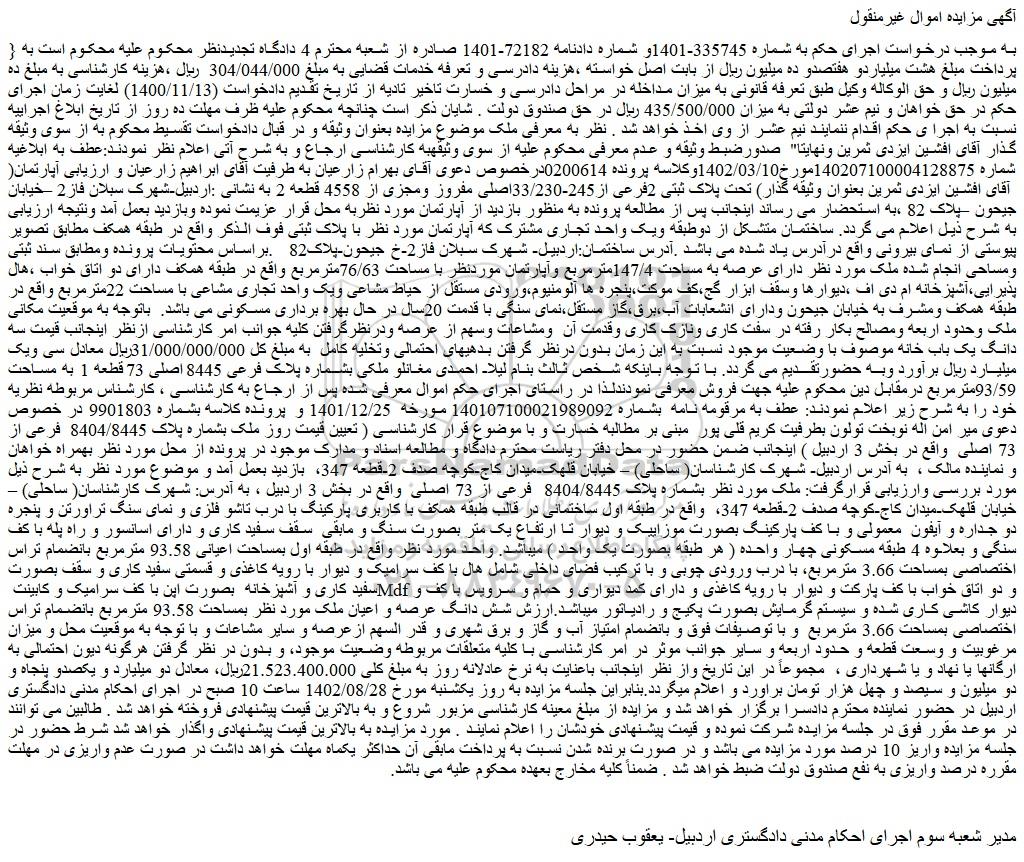 شعبه صادر کننده:شعبه سوم اجرای احکام مدنی دادگستری شهرستان اردبیل