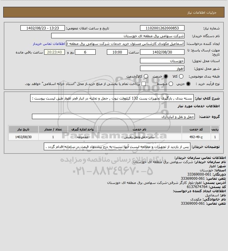 شرح کلی نیاز: بسته بندی , بارگیری تجهیزات پست 132 کیلوولت نبوت , حمل و تخلیه در انبار فجر اهواز طبق لیست  پیوست :
