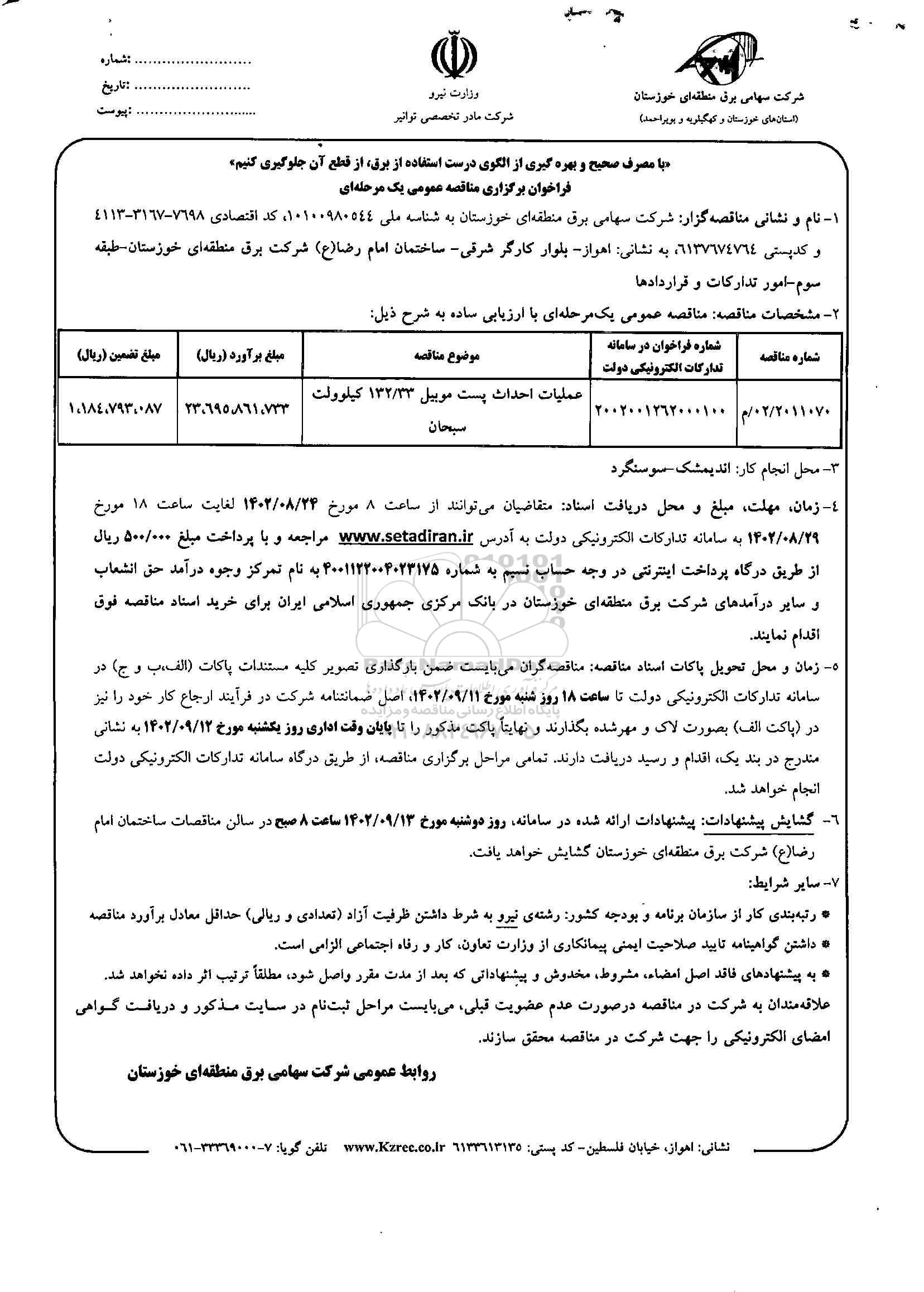 | 02/2011070/م | 2002001262000100 | عملیات احداث پست موبیل 132.33 کیلوولت سبحان  |