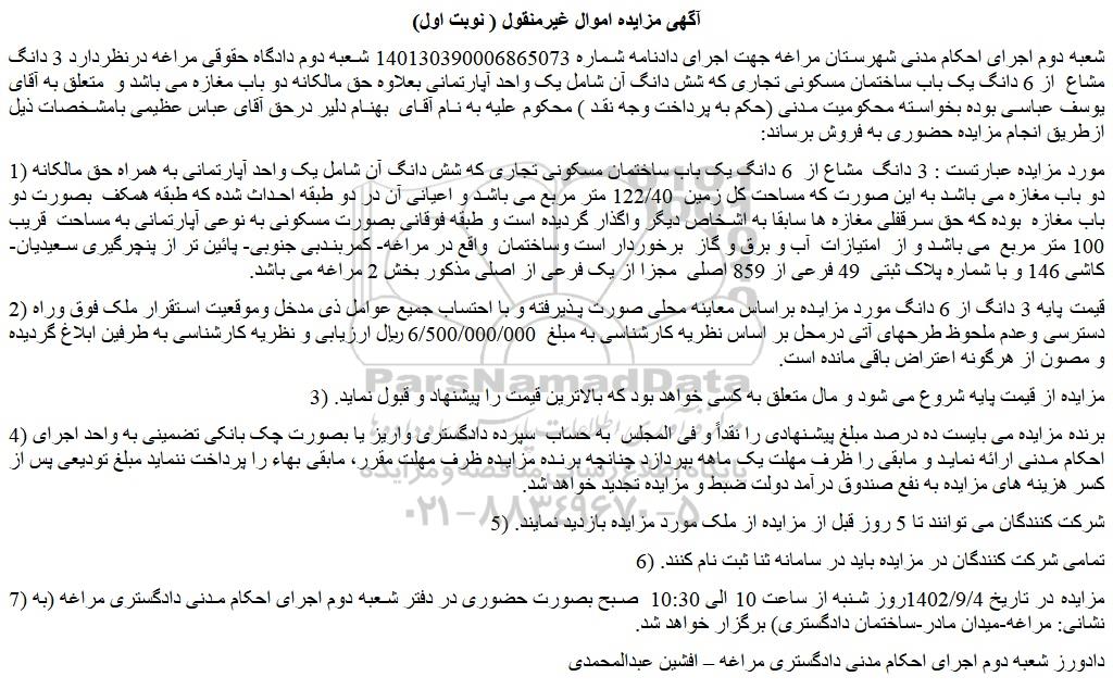 شعبه دوم اجرای احکام مدنی شهرستان مراغه جهت اجرای دادنامه شماره 140130390006865073 شعبه دوم دادگاه حقوقی مراغه درنظردارد 3 دانگ مشاع  از 6 دانگ یک باب ساختمان مسکونی تجاری که شش دانگ آن شامل یک واحد آپارتمانی بعلاوه حق مالکانه دو باب مغازه می باشد و  متعلق به آقای یوسف عباسی بوده بخواسته محکومیت مدنی (حکم به پرداخت وجه نقد ) محکوم علیه به نام آقای  بهنام دلیر درحق آقای عباس عظیمی بامشخصات ذیل ازطریق انجام مزایده حضوری به فروش برساند: