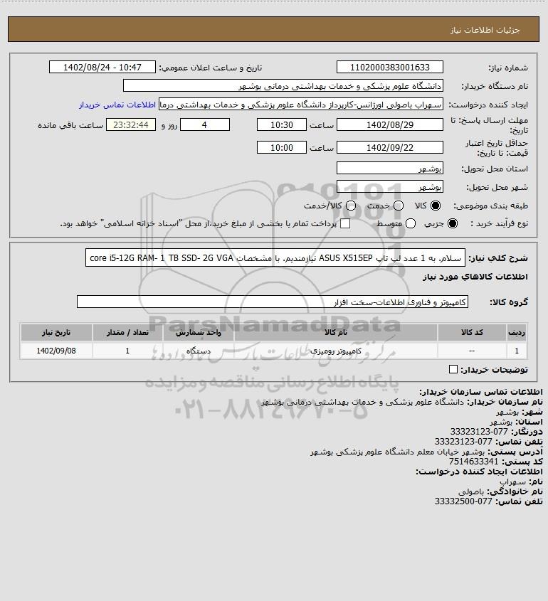 شرح کلی نیاز: سلام. به 1 عدد لپ تاپ ASUS X515EP نیازمندیم. با مشخصات core i5-12G RAM- 1 TB SSD- 2G VGA