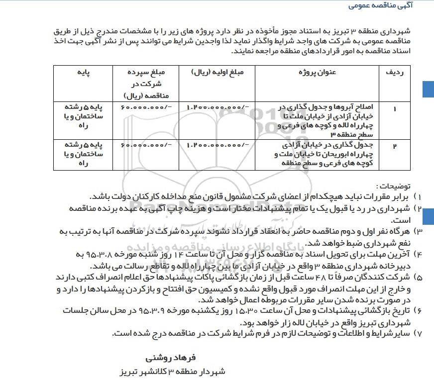 شهرداری منطقه 3 تبریز به استناد مجوزهای ماخوذه در نظر دارد پروژه های زیر را با مشخصات مندرج ذیل از طریق مناقصه عمومی به پیمانکاران و شرکت های واجد شرایط واگذار نماید. لذا واجدین شرایط می توانند پس از نشر آگهی جهت اخذ اسناد مناقصه به امور قراردادهای منطقه مراجعه نمایند.