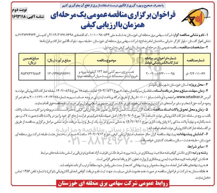 گشایش پیشنهادات : پیشنهاد مناقصه گران حائز حدنصاب امتیاز ارزیابی کیفی مورخ 1402.9.13 ساعت 8 صبح در ساختمان هشت طبقه شرکت برق منطقه ای خوزستان طبقه هشت سالن مناقصات گشایش خواهد یافت .