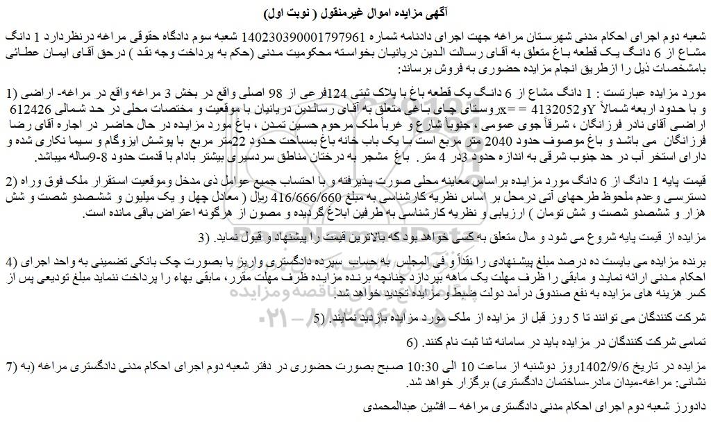 شعبه دوم اجرای احکام مدنی شهرستان مراغه جهت اجرای دادنامه شماره 140230390001797961 شعبه سوم دادگاه حقوقی مراغه درنظردارد 1 دانگ مشاع از 6 دانگ یک قطعه باغ متعلق به آقای رسالت الدین دریانیان بخواسته محکومیت مدنی (حکم به پرداخت وجه نقد ) درحق آقای ایمان عطائی بامشخصات ذیل را ازطریق انجام مزایده حضوری به فروش برساند: