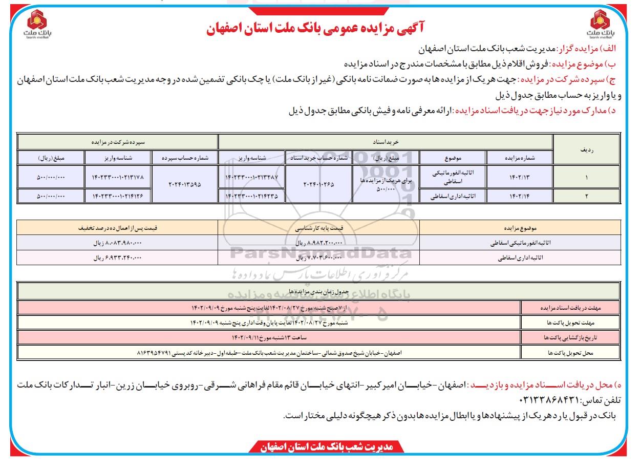 آگهی مزایده عمومی بانک ملت استان اصفهان -