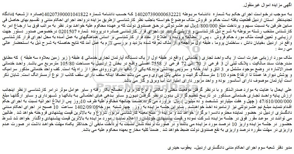 علی ایحال با عنایت به موارد صدرالذکر و با درنظر گرفتن موقعیت محلی و مکانی و نوع کاربری و مصالح بکار رفته و سایر عوامل موثر درامر کارشناسی ازنظر اینجانب ارزش پایه واحد تجاری خدماتی مذکور در تاریخ تنظیم گزارش بدون درنظر گرفتن دیون و سایر بدهی های احتمالی به بانکها و شهرداری و سایر ارگانها مبلغ 47/610/000/000 ( چهل و هفت میلیاردو ششصد و ده میلیون ) ریال  برآورد می گردد.ضمنا چنانچه محکوم علیه ظرف 10روز پس ازابلاغ اجرائیه نسبت به اجرای حکم اقدام ننماید مبلغ نیم عشردولتی نیز ازنامبرده اخذ خواهدشد . بنابراین جلسه مزایده به روز   چهارشنبه  مورخه1402/09/08 ساعت  10 صبح در اجرای احکام مدنی دادگستری اردبیل در حضور نماینده محترم دادسرا برگزار خواهد شد و مزایده از مبلغ معینه کارشناسی مزبور شروع و به بالاترین قیمت پیشنهادی فروخته خواهد شد . طالبین می توانند در موعد مقرر فوق در جلسه مزایده شرکت نموده و قیمت پیشنهادی خودشان را اعلام نمایند . مورد مزایده به بالاترین قیمت پیشنهادی واگذار خواهد شد شرط حضور در جلسه مزایده واریز 10 درصد مورد مزایده می باشد و در صورت برنده شدن نسبت به پرداخت مابقی آن حداکثر یکماه مهلت خواهد داشت در صورت عدم واریزی در مهلت مقرره درصد واریزی به نفع صندوق دولت ضبط خواهد شد . ضمناً کلیه مخارج بعهده محکوم علیه می باشد.