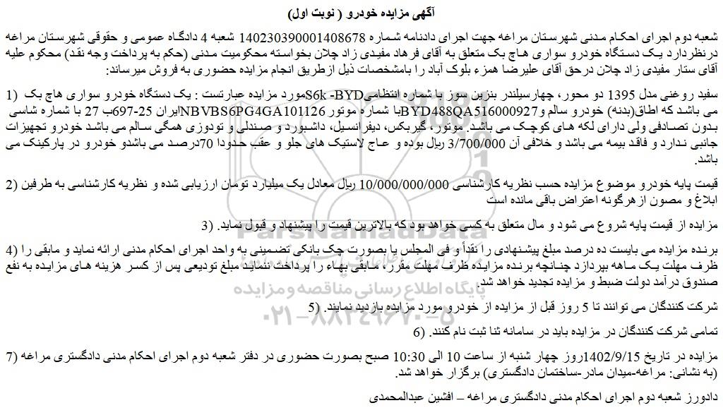 شعبه دوم اجرای احکام مدنی شهرستان مراغه جهت اجرای دادنامه شماره 140230390001408678 شعبه 4 دادگاه عمومی و حقوقی شهرستان مراغه درنظردارد یک دستگاه خودرو سواری هاچ بک متعلق به آقای فرهاد مفیدی زاد چلان بخواسته محکومیت مدنی (حکم به پرداخت وجه نقد) محکوم علیه آقای ستار مفیدی زاد چلان درحق آقای علیرضا همزء بلوک آباد را بامشخصات ذیل ازطریق انجام مزایده حضوری به فروش میرساند: