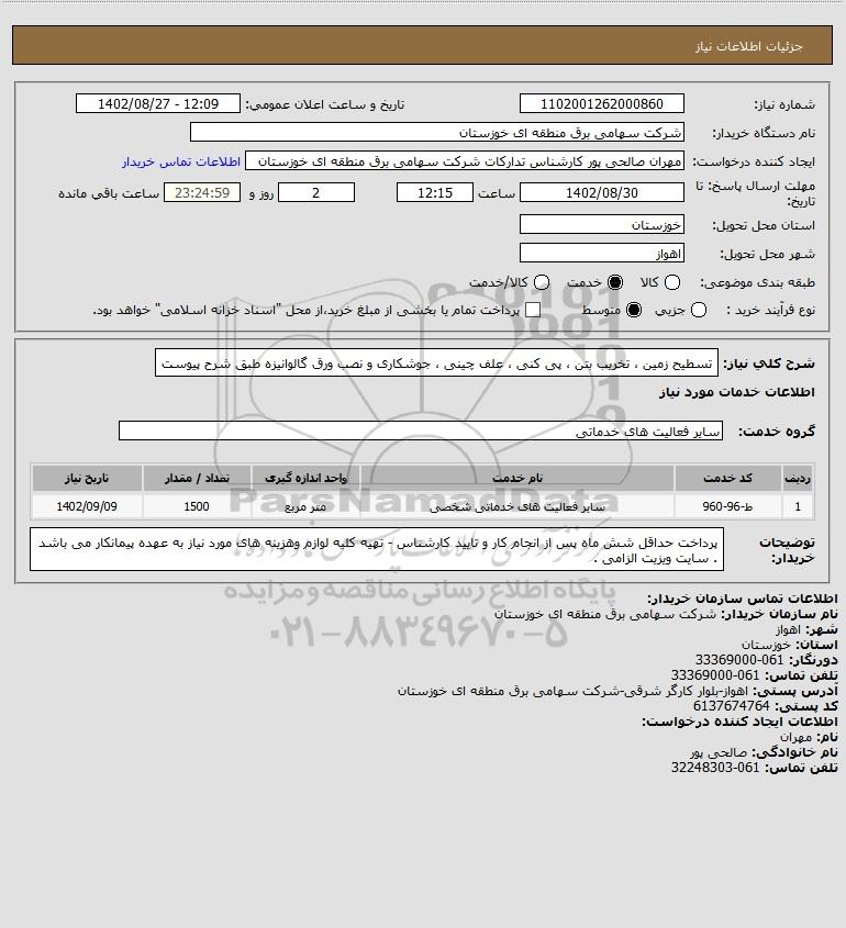 استعلام تسطیح زمین ، تخریب بتن ، پی کنی ، علف چینی ، جوشکاری و نصب ورق گالوانیزه طبق شرح پیوست, استعلام تسطیح زمین ، تخریب بتن ، پی کنی ، علف چینی ، جوشکاری و نصب ورق گالوانیزه طبق شرح پیوست