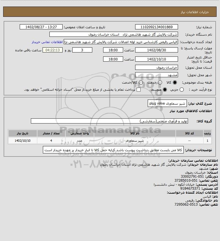 نام دستگاه خریدار:شرکت پالایش گاز شهید هاشمی نژاد استان خراسان رضوی
