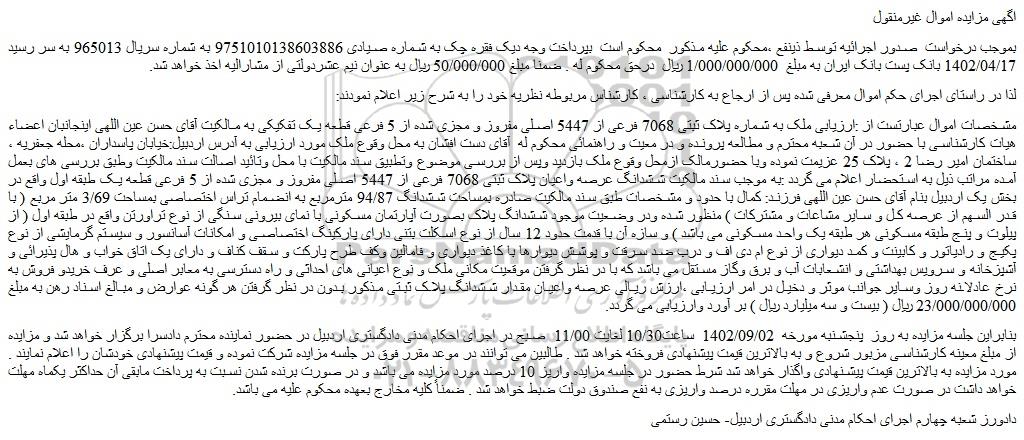 مشخصات اموال عبارتست از :ارزیابی ملک به شماره پلاک ثبتی 7068 فرعی از 5447 اصلی مفروز و مجزی شده از 5 فرعی قطعه یک تفکیکی به مالکیت آقای حسن عین اللهی اینجانبان اعضاء هیات کارشناسی با حضور در آن شعبه محترم و مطالعه پرونده و در معیت و راهنمائی محکوم له  آقای دست افشان به محل وقوع ملک مورد ارزیابی به آدرس اردبیل:خیابان پاسداران ،محله جعفریه ، ساختمان امیر رضا 2 ، پلاک 25 عزیمت نموده وبا حضورمالک ازمحل وقوع ملک بازدید وپس از بررسی موضوع وتطبیق سند مالکیت با محل وتائید اصالت سند مالکیت وطبق بررسی های بعمل آمده مراتب ذیل به استحضار اعلام می گردد :به موجب سند مالکیت ششدانگ عرصه واعیان پلاک ثبتی 7068 فرعی از 5447 اصلی مفروز و مجزی شده از 5 فرعی قطعه یک طبقه اول واقع در بخش یک اردبیل بنام آقای حسن عین اللهی فرزند: کمال با حدود و مشخصات طبق سند مالکیت صادره بمساحت ششدانگ 94/87 مترمربع به انضمام تراس اختصاصی بمساحت 3/69 متر مربع ( با قدر السهم از عرصه کل و سایر مشاعات و مشترکات ) منظور شده ودر وضعیت موجود ششدانگ پلاک بصورت آپارتمان مسکونی با نمای بیرونی سنگی از نوع تراورتن واقع در طبقه اول ( از پیلوت و پنج طبقه مسکونی هر طبقه یک واحد مسکونی می باشد ) و سازه آن با قدمت حدود 12 سال از نوع اسکلت بتنی دارای پارکینگ اختصاصی و امکانات آسانسور و سیستم گرمایشی از نوع پکیج و رادیاتور و کابینت و کمد دیواری از نوع ام دی اف و درب ضد سرقت و پوشش دیوارها با کاغذ دیواری و فامالین وکف طرح پارکت و سقف کناف و دارای یک اتاق خواب و هال پذیرائی و آشپزخانه و سرویس بهداشتی و انشعابات آب و برق وگاز مستقل می باشد که با در نظر گرفتن موقعیت مکانی ملک و نوع اعیانی های احداثی و راه دسترسی به معابر اصلی و عرف خریدو فروش به نرخ عادلانه روز وسایر جوانب موثر و دخیل در امر ارزیابی ،ارزش ریالی عرصه واعیان مقدار ششدانگ پلاک ثبتی مذکور بدون در نظر گرفتن هر گونه عوارض و مبالغ اسناد رهن به مبلغ 23/000/000/000 ریال ( بیست و سه میلیارد ریال ) بر آورد وارزیابی می گردد.