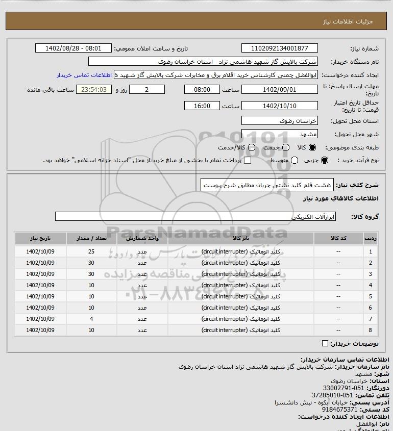نام دستگاه خریدار:شرکت پالایش گاز شهید هاشمی نژاد استان خراسان رضوی