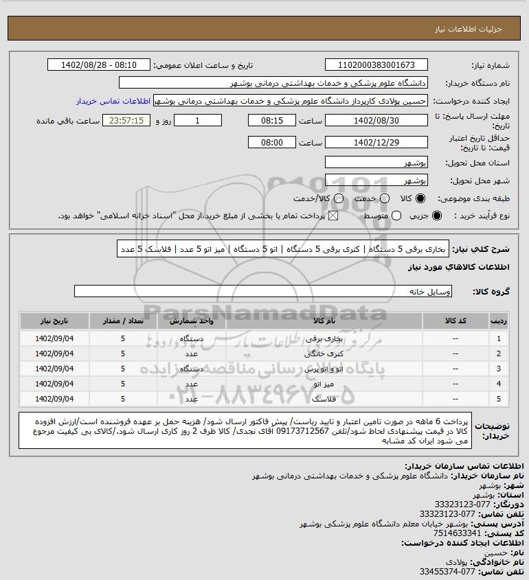استعلام بخاری برقی 5 دستگاه | کتری برقی 5 دستگاه | اتو 5 دستگاه | میز اتو 5 عدد | فلاسک 5 عدد, استعلام بخاری برقی 5 دستگاه | کتری برقی 5 دستگاه | اتو 5 دستگاه | میز اتو 5 عدد | فلاسک 5 عدد