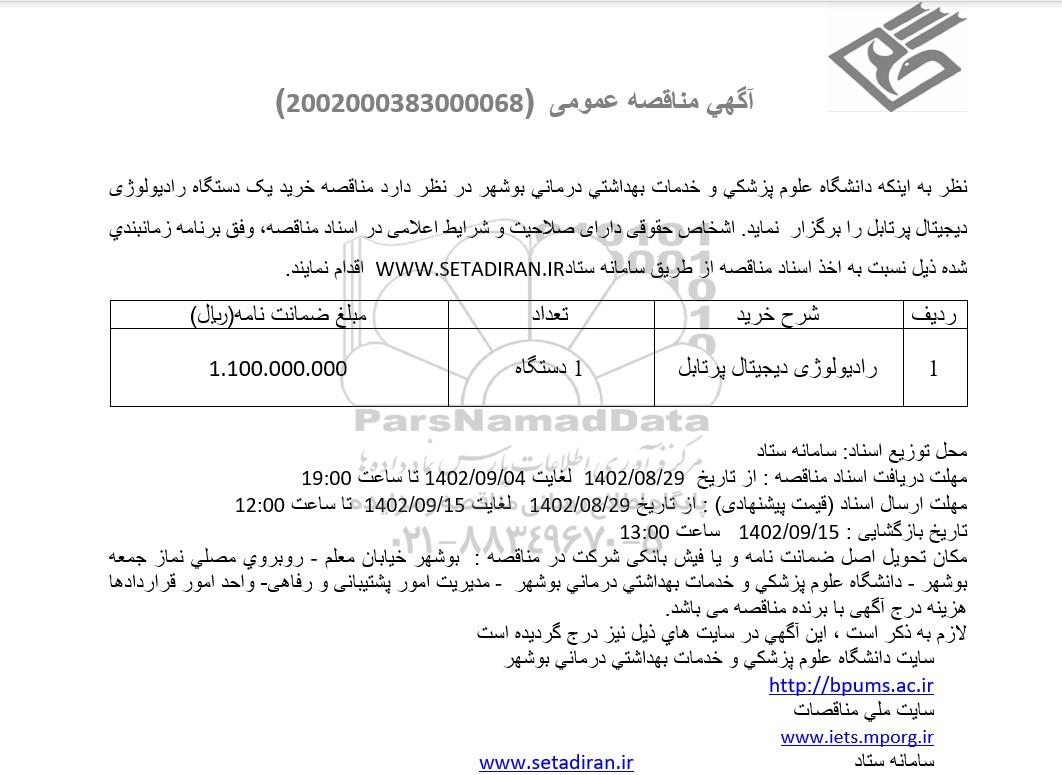نظر به اینكه دانشگاه علوم پزشكی و خدمات بهداشتی درمانی بوشهر در نظر دارد مناقصه خرید یک دستگاه رادیولوژی دیجیتال پرتابل را برگزار نماید. اشخاص حقوقی دارای صلاحیت و شرایط اعلامی در اسناد مناقصه، وفق برنامه زمانبندی شده ذیل نسبت به اخذ اسناد مناقصه از طریق سامانه ستاد اقدام نمایند.
