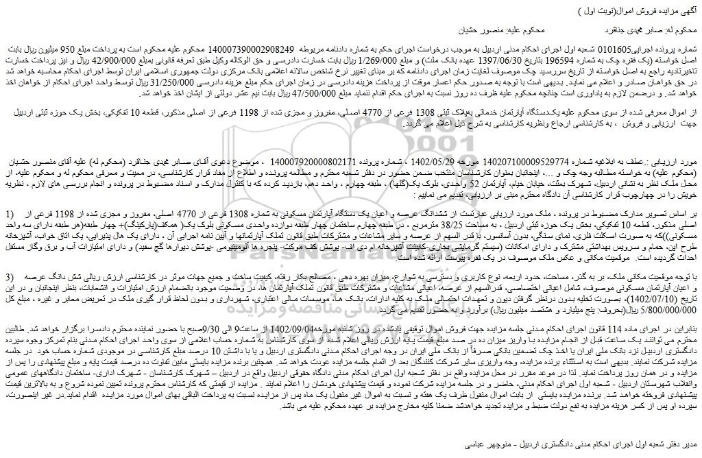 از اموال معرفی شده از سوی محکوم علیه یک دستگاه آپارتمان خدماتی به پلاک ثبتی 1308 فرعی از 4770 اصلی، مفروز و مجزی شده از 1198 فرعی از اصلی مذکور، قطعه 10 تفکیکی، بخش یک حوزه ثبتی اردبیل جهت ارزیابی و فروش ، به کارشناسی ارجاع ونظریه کارشناسی به شرح ذیل اعلام می گردد.