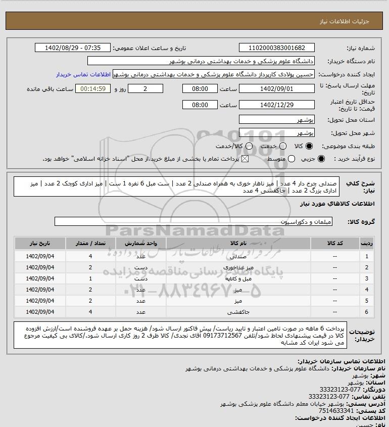 شرح کلی نیاز: صندلی چرخ دار 4 عدد | میز ناهار خوری به همراه صندلی 2 عدد | ست مبل 6 نفره 1 ست | میز اداری کوچک 2 عدد | میز اداری بزرگ 2 عدد | جاکفشی 4 عدد